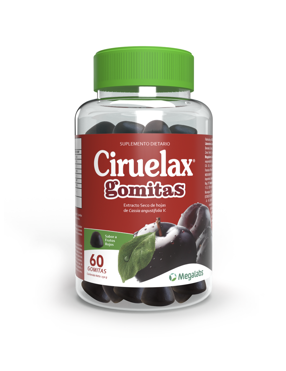 Ciruelax en deliciosas Gomitas sabor a frutos rojos contiene extracto de Sen y extracto de Ciruela que ayuda a regular el tránsito intestinal y favorece el bienestar intestinal para toda la familia.